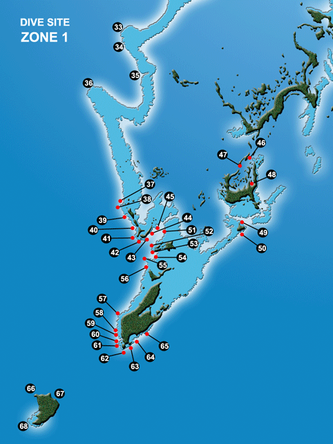 33. Siaes Corner 34. Siaes Tunnel 35. Ulong Channel 36. Shark City 37. Blue Holes 38. Blue Corner 39. Virgin Blue Hole 40. Ngemelis Coral Garden 41. New Drop-off 42. Fern's Wall (Turtle Wall) 43. Big Drop-off 44. Ngemelis Wall 45. German Wall / Channel 46. Clam City 47. Wonder Channel 48. Jellyfish Lake (snorkel) 49. Ngerchong Inside 50. Ngerchong Outside 51. Alice's Garden 52. Barnum's Wall 53. Turtle Cove 54. Ngedebus Coral Garden 55. Ngedebus Corner 56. Ngedebus West 57. White Beach Point 58. Orange Beach 59. South Dock 60. Peleliu Wall 61. Peleliu Cut 62. Peleliu Corner 63. Peleliu Express 64. Yellow Wall 65. Honeymoon Beach 66. Santa Maria Point 67. Runway Wall 68. USS Perry (Tec/Trimix)